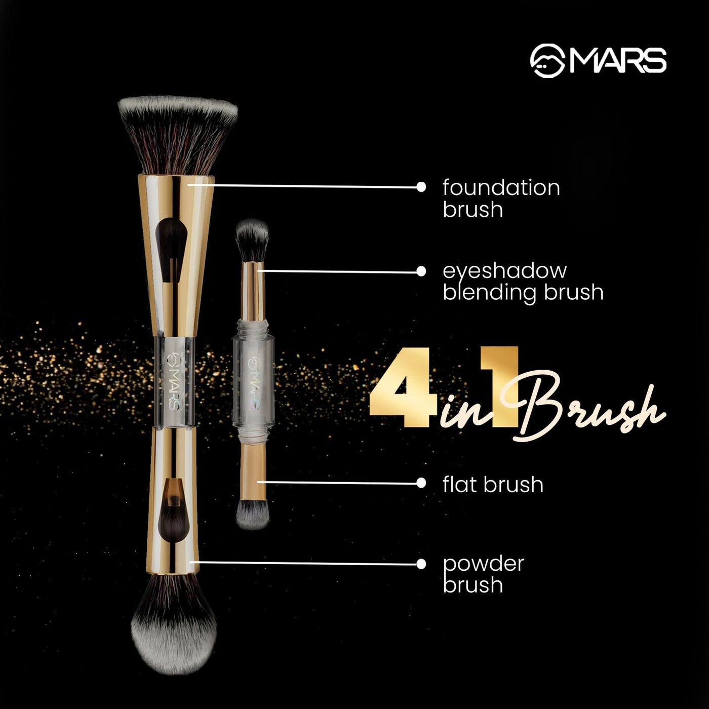Be your own team. MARS 4 in 1 Travel Brush is a multifunctional brush which has a foundation brush, a powder brush, an eyeshadow blending brush and a flat brush, all in one.